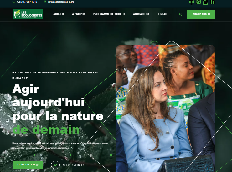 Les Écologistes Côte d’Ivoire est un mouvement engagé pour la protection de l’environnement et le développement durable. Le site présente la vision, les actions et les projets du mouvement en faveur d’une Côte d’Ivoire plus verte. Il met en avant des initiatives écologiques, sociales et citoyennes. La plateforme sert également d’outil d’information et de mobilisation. Elle s’adresse aux citoyens, militants et partenaires sensibles aux enjeux environnementaux.